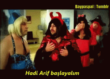 Kolpaçino characters in funny costumes, including a devil and a bunny, engage in a comedic dialogue.