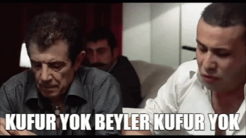 Ganyotçu, Ekrem Abi, and Sabri Abi at a table, with Ganyotçu telling everyone 'no cursing'.