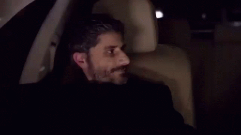 Kolpacino Altan, a man with a beard, is sitting in a car at night, looking to the side.