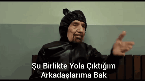 A scene from Kolpaçino, an older man in black costume says 'Look at my friends I set out with'.