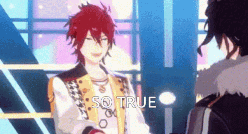 Rei Sakuma and Rinne Amagi from Ensemble Stars interact, with the caption 'SO TRUE' appearing on screen.