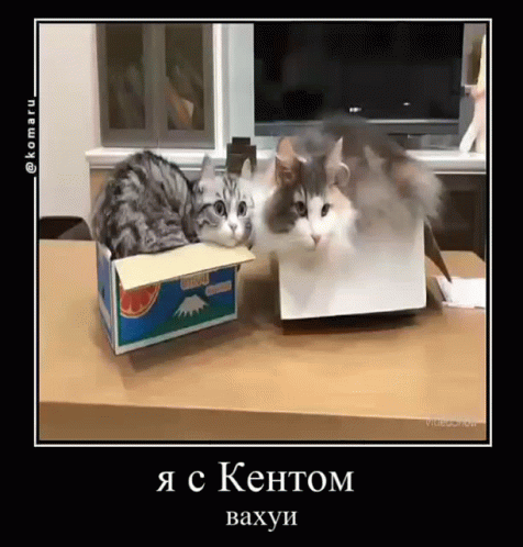 Komaru and Kent, two cats, are seen sitting in cardboard boxes on a table, looking surprised.