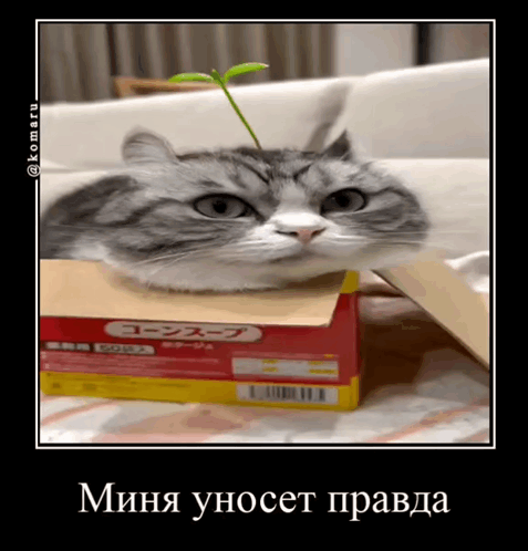 Komaru the cat sits in a corn soup box with a sprout on its head, accompanied by the meme text 'Mina carries away the truth'.