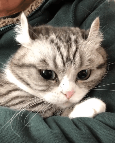 Komaru the cat with big, expressive eyes relaxing on a lap, looking adorable and curious.