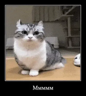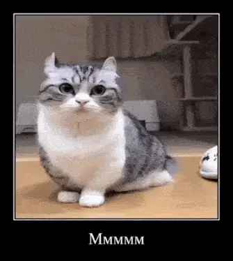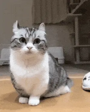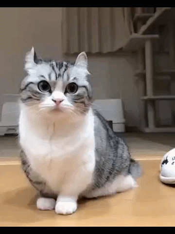 A cute cat named Komaru with folded ears looks around attentively as the word 'bananas' appears on screen.