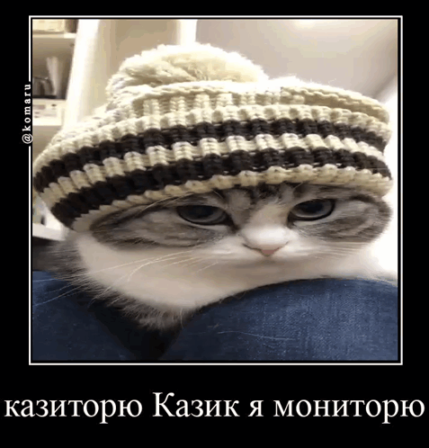Komaru, a cat in a knitted hat, intently monitors the casino.