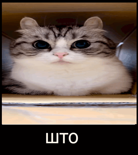 Komaru Mugimeshi323, the fluffy cat, sits in a cardboard box with a surprised expression, asking 'WHAT?'