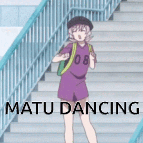 Najimi Osana from Komi Can't Communicate performs a lively dance on stairs, with 'MATU DANCING' text.