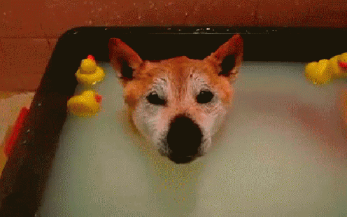 Funny Shiba Inu dog enjoying a relaxing bath with rubber ducks, looking happy and content.