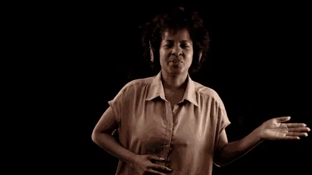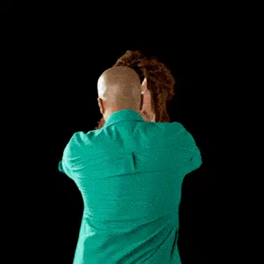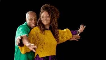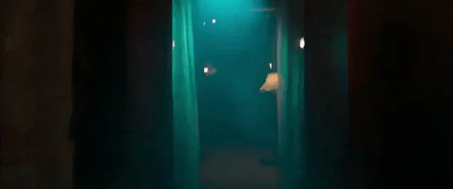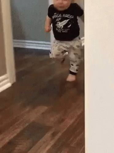 A baby runs energetically across a wooden floor, with 'Hej då' (Goodbye) appearing, humorously depicting a quick exit.