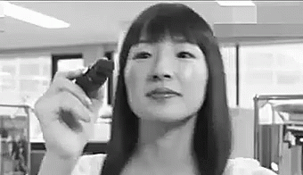 Marie Kondo 近藤 麻理恵 creates stylized face art with a small object in this black and white clip.