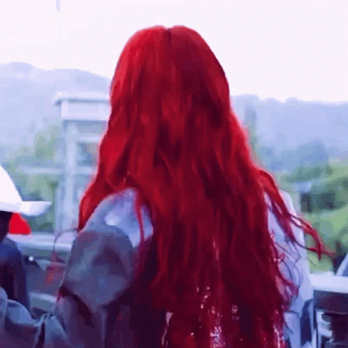 Kong Xueer (Kong Sherry) with vibrant red hair, striking a pose with a dramatic hair flip and intense gaze.