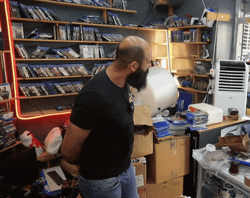 Konsoloyun Taner in a game store surrounded by PlayStation games.