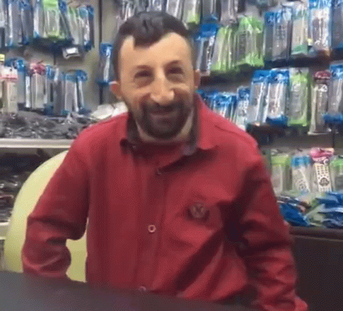 Koksal Baba passionately swears and gestures in a shop, using the Persian insult 'Kooni' while making a strong point.