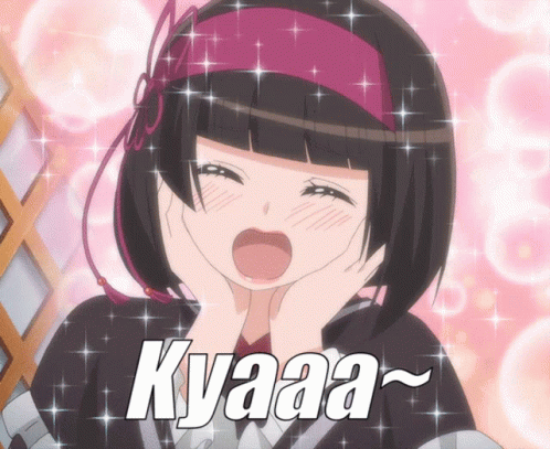Mio from Tsukimichi: Moonlit Fantasy, blushing and smiling with a 'Kyaaa' expression in a cute anime style.