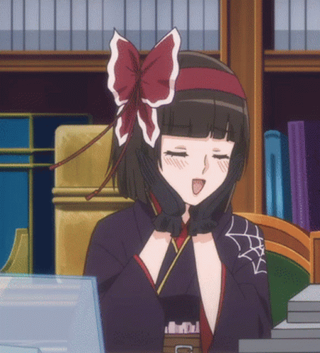 Mio from Tsukimichi: Moonlit Fantasy, an anime girl with a red bow, happily sits at a desk.