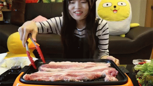YouTuber Togimochi prepares Korean Barbeque Samgyeopsal, placing raw pork belly on a hot grill.