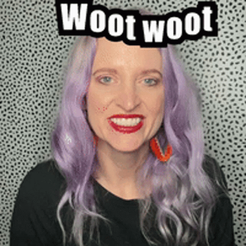 Korey with purple hair enthusiastically says 'Woot Woot' with hands raised.