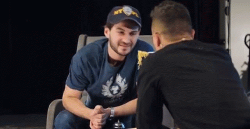 Ilya Sobolev, wearing a hat and blue shirt, is being fed noodles by another man while sitting in a chair.