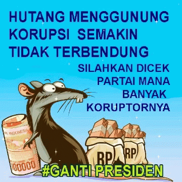Cartoon rat with Indonesian Rupiah, symbolizing corruption and debt, calling to change the president. Mentions political figures Prabowo, Rocky Gerung.
