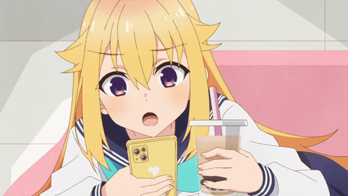 Koshitan checking her phone while resting on a couch with a drink, possibly talking with Torako.