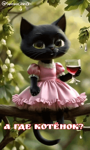 A charming black cat in a pink dress sits on a tree branch, holding a glass of red wine.