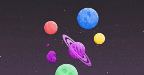 Animated colorful planets, including a ringed purple planet, float among stars in a vibrant cosmic scene.