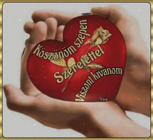 Hands holding a red heart with a golden rose and a heartfelt Hungarian thank you message.