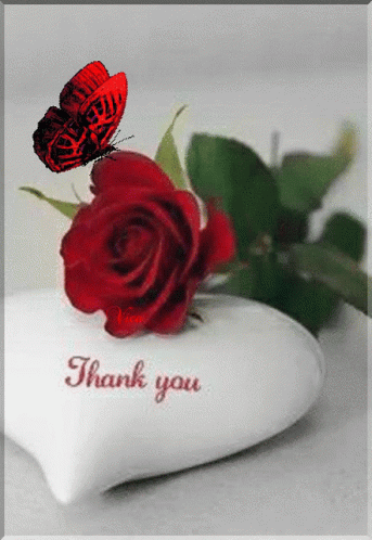 A vibrant red rose with a red butterfly rests on a white heart-shaped object displaying 'Thank you'.
