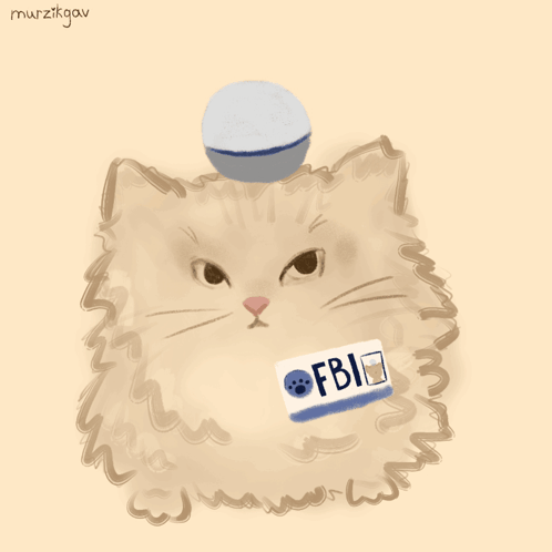 Fluffy cat named Fib with an intense expression, wearing an FBI badge.