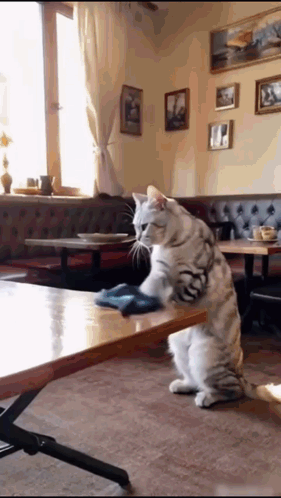 A smart cat diligently cleans various surfaces, including a table, window, and TV screen, with a cloth.