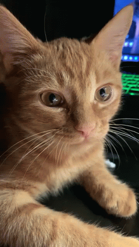 Кот Персик, an orange tabby cat, looks intently at the camera with a green keyboard in the background.