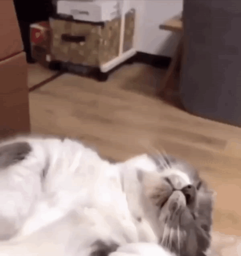 A fluffy cat lying on its back suddenly wakes up with a start, looking startled.