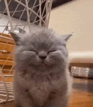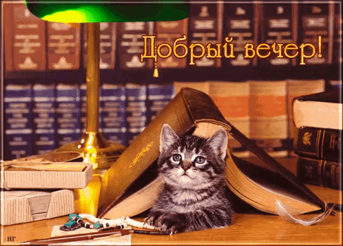 A cute kitten peeks out from behind an open book on a desk, with a 'Good evening!' greeting displayed.