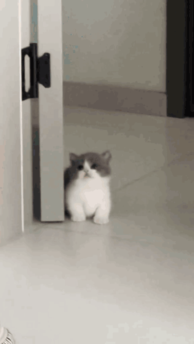 a gray and white cat is standing in a hallway next to a door .