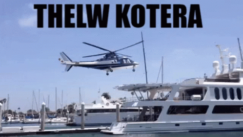 A helicopter flies over yachts in a marina, with Greek text 'Kotera Elikoptera' displayed.