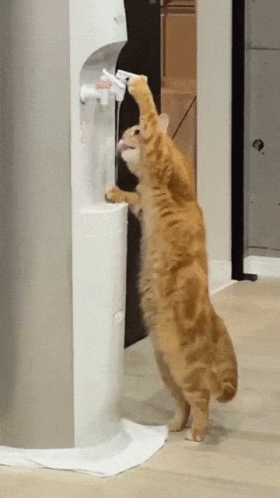 An intelligent orange cat stands on its hind legs to drink fresh water from a dispenser.
