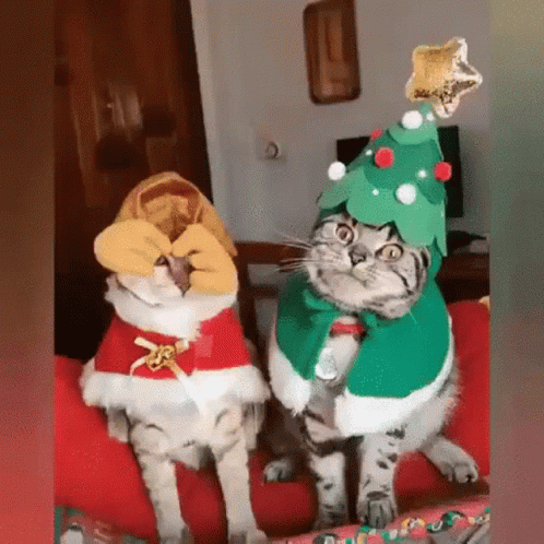 Two cats dressed in festive Christmas and New Year costumes, sitting on a red couch.