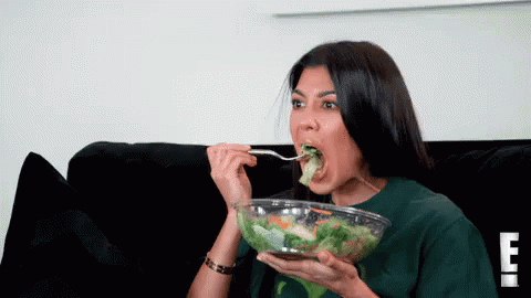 Kourtney Kardashian eating a large salad from a bowl while sitting on a couch.