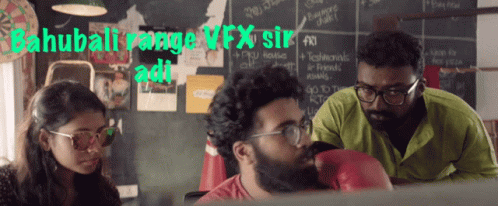 Koushik Kowshik, wearing boxing gloves, talks to a woman and another man, discussing 'Bahubali range VFX'.