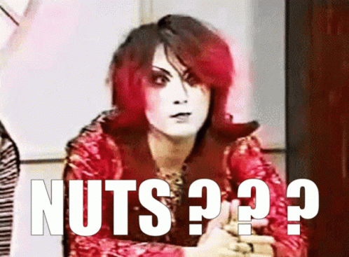 Kozi from Malice Mizer with striking red hair and makeup, reacting to the word 'NUTS ???' on screen.