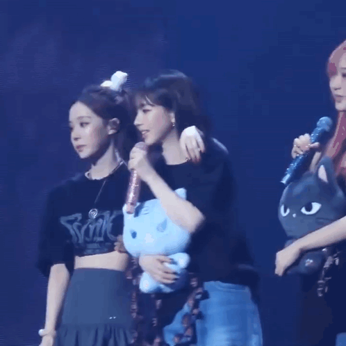 Aespa members Karina and Winter share a sweet hug on stage during a performance, with Winter holding a plush toy.