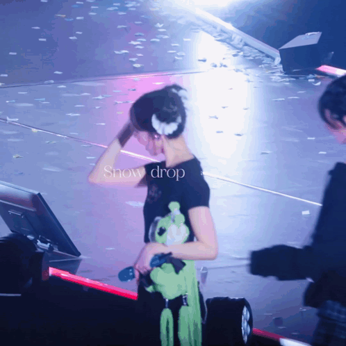 a woman in a black shirt with a frog on it stands on a stage with snow drop written on it
