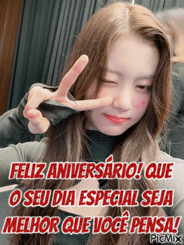 LE SSERAFIM's Garam winks and makes a peace sign, celebrating a happy birthday with a special message.
