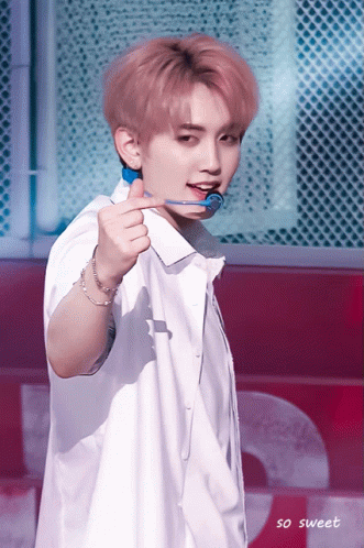 K-pop idol Mashiho from Treasure makes a sweet finger heart gesture on stage.