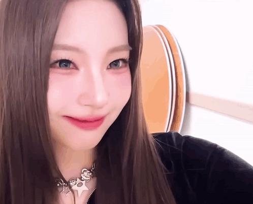 a close up of a woman 's face with a necklace around her neck .