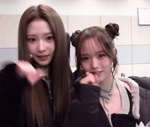 Kpop group Triples members Hayeon and Seoah make thumbs down gestures.