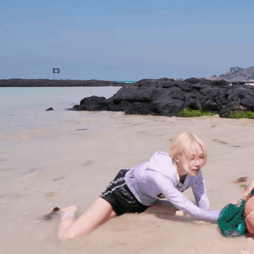 Kpop group Triples member Nakyoung gets hilariously stuck in the sand on the beach, declaring 'I lost'.
