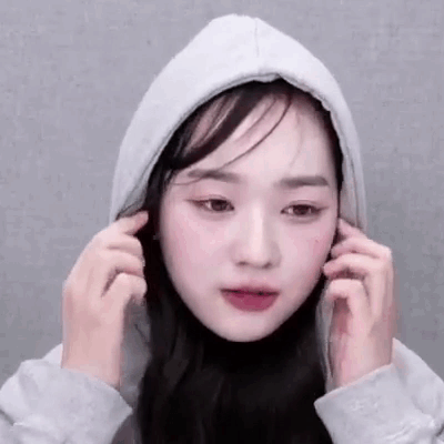 Soomin from Kpop group Triples playfully adjusts her hoodie, covering her ears and making a silly face.