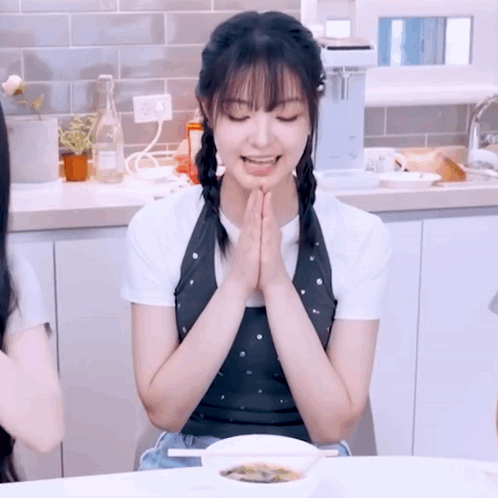 Kpop Triples member Lynn, with braided hair and an apron, prepares to eat a meal at a table.
